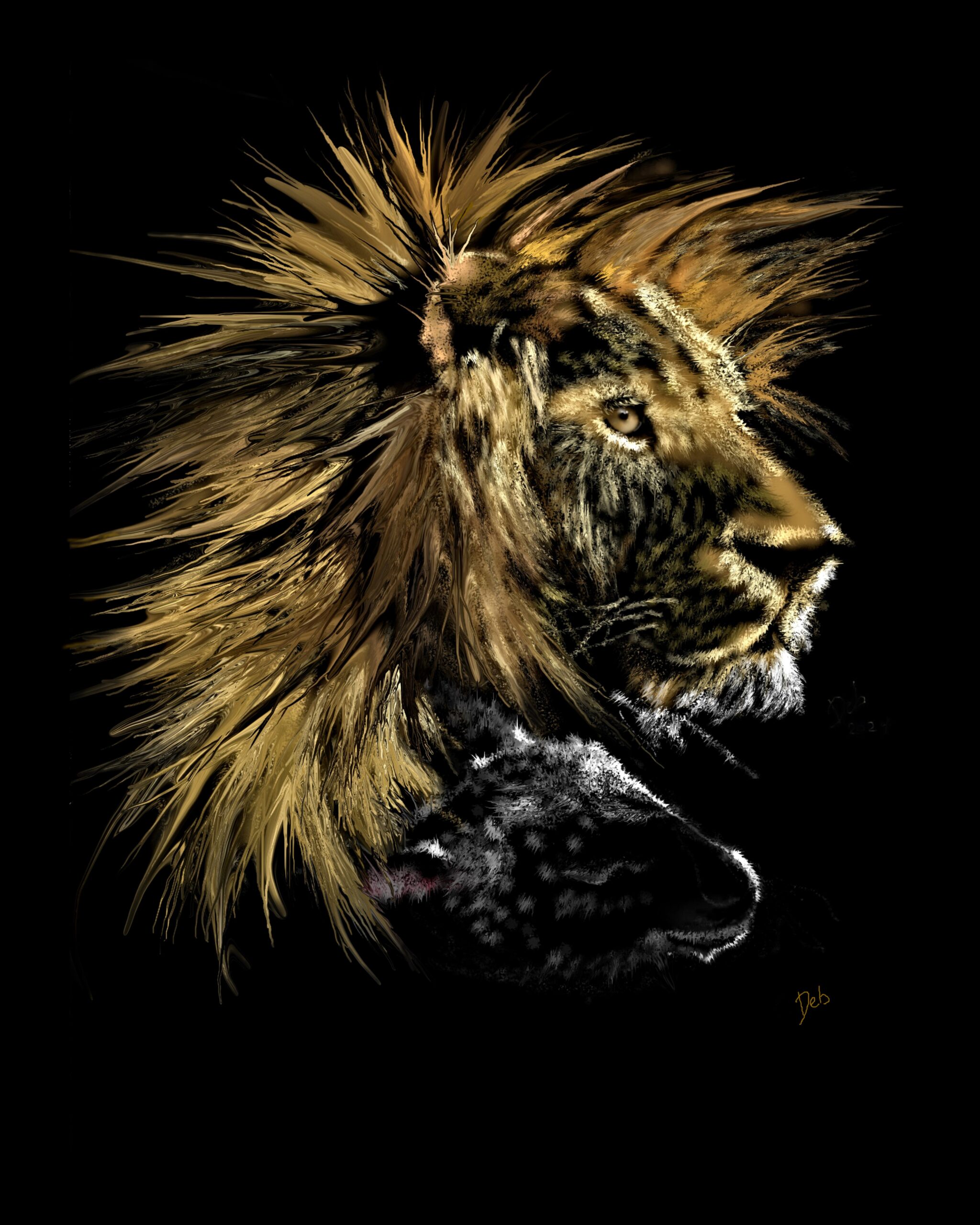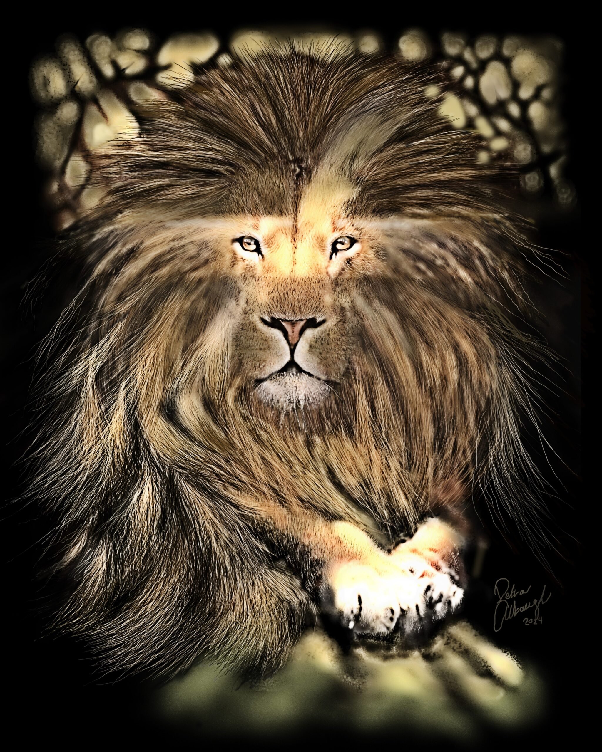 The Lion of Judah is painted representing His victory over death, seated under a thorn bush, with three crosses reflected in His eyes. My digital painting has been developed over a number of years while learning digital painting. This rendition is from 2025. And is available in a number of print sizes from 8″ x 6.5″ up to 32″ x 40″ in print, and on canvas, metal print, and wood print. Also available printed is a sherpa fleece blanket, and coffee mug.