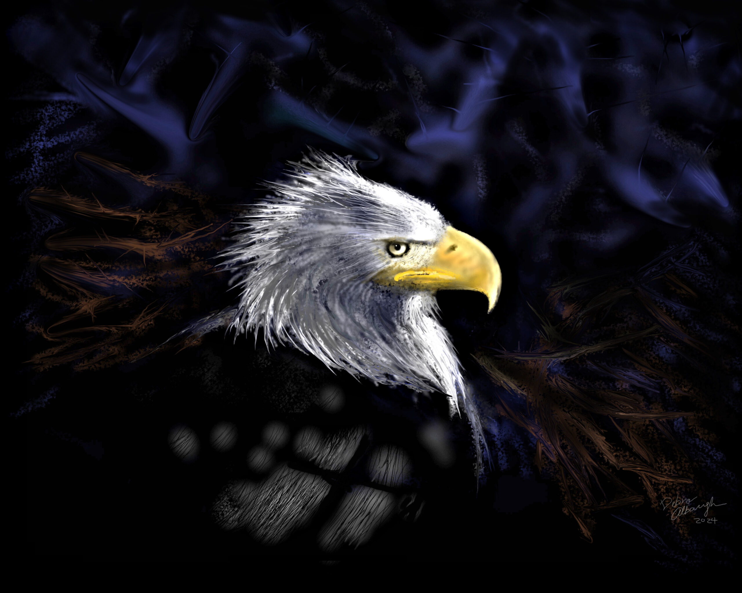 The eagle is wide awake at the midnight hour. My digital painting is from 2025. And is available in a number of print sizes from 8″ x 6.5″ up to 36″ x 29″ in print, and on canvas, metal print, and wood print. Also available printed is a sherpa fleece blanket, beach towel, towel, throw pillow, tote bag, weekender, exercise mat, coffee mug, notebook, card, and t-shirts in a range of styles and sizes, a zippered pouch, a portable battery charger, and other printed decor and art print items.