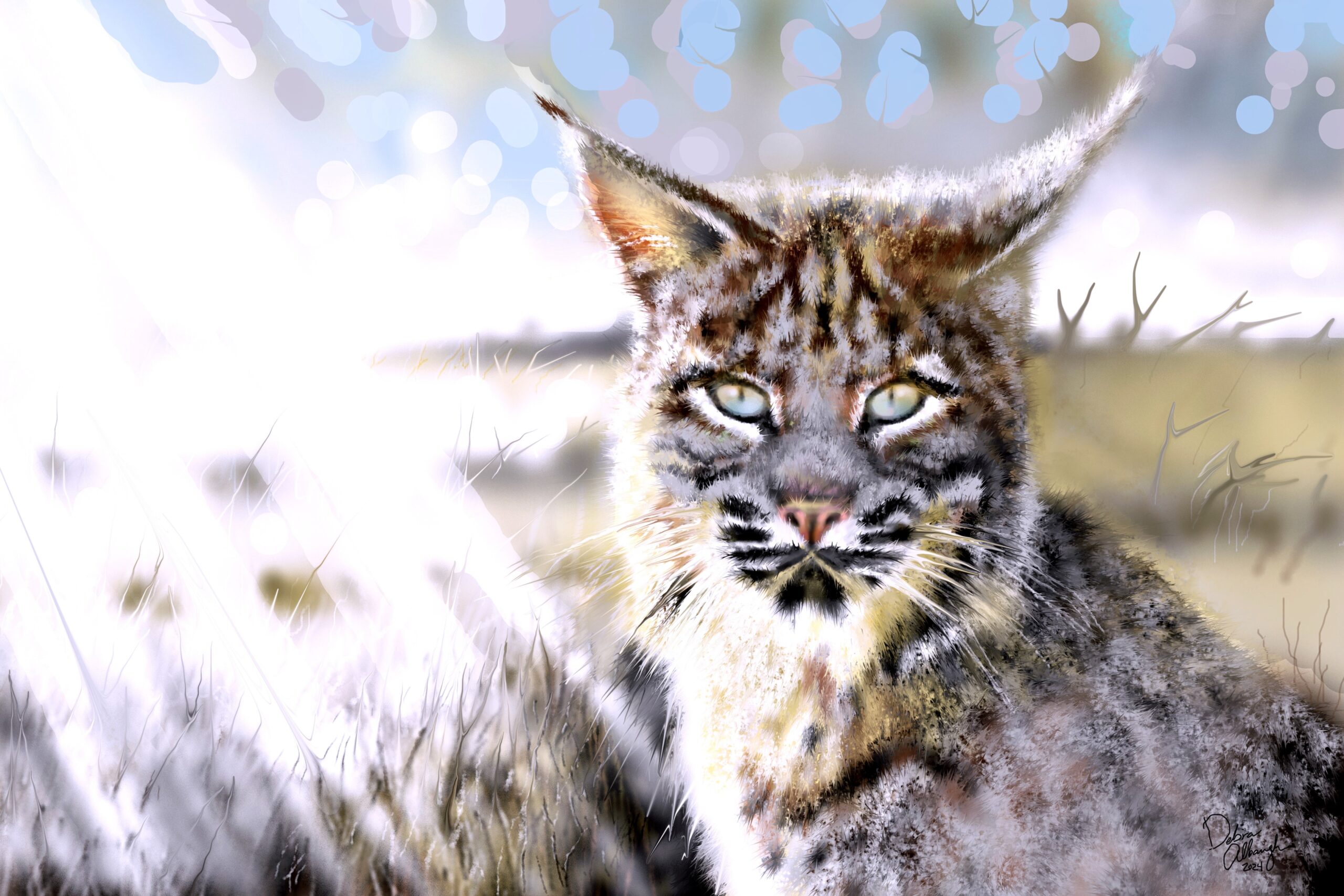 The morning meadow is visited by a lynx or bobcat. My digital painting is from 2025 and represents my effort to learn digital wildlife painting. And is available in a number of print sizes from 8″ x 5.5″ up to 36″ x 24″ in print, and on canvas, metal print, and wood print. Also available printed is a sherpa fleece blanket, towel, throw pillow, tote bag, weekender, coffee mug, zippered pouch, portable battery charger, and a card.