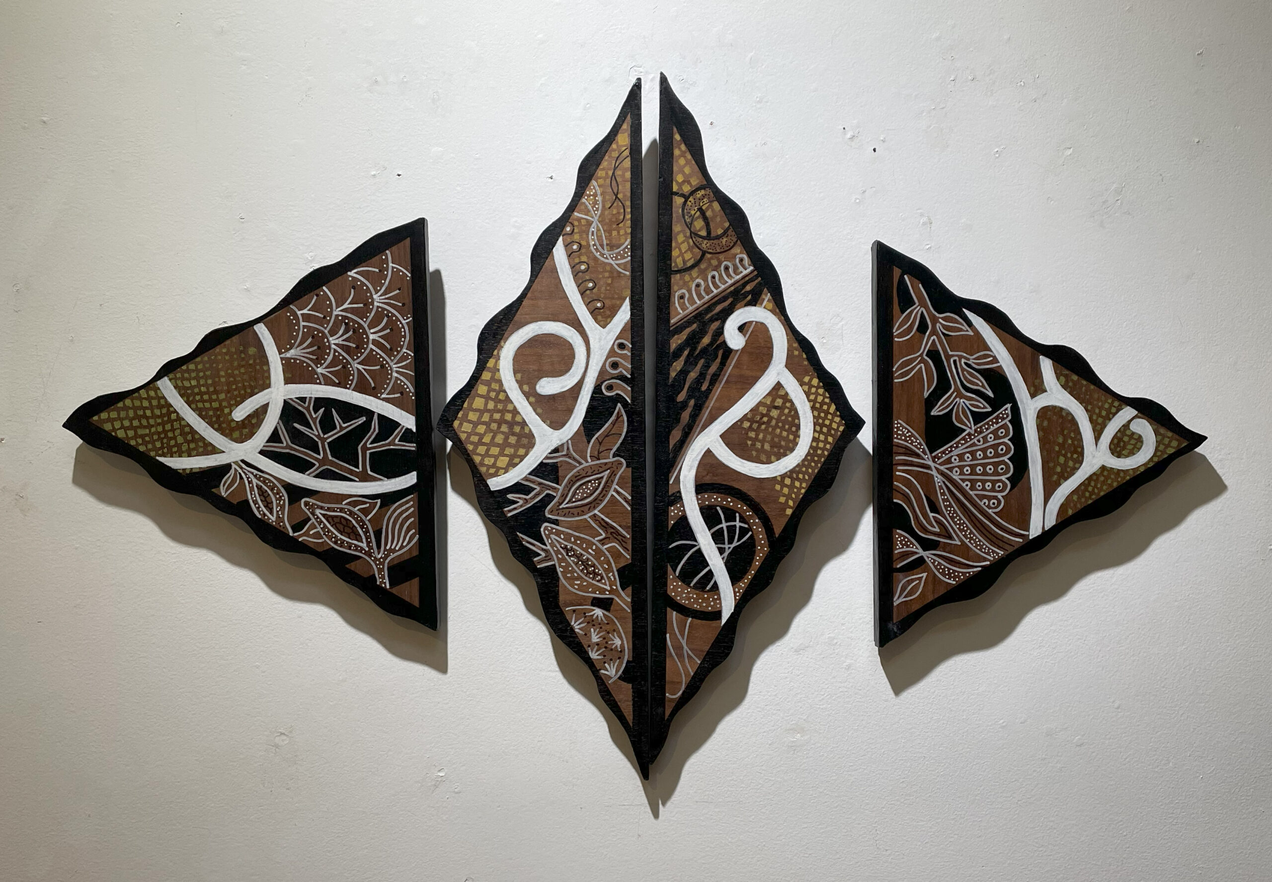 28″x7.5″x1.5″, Carved and painted hickory wood. 2026. Represents celestial imagery.